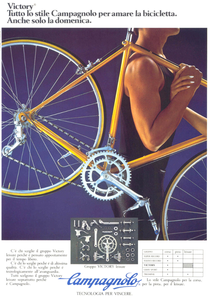 Mi fa impazzire vedere i vecchi scalatori sulle cime più estreme sfoggiare i loro vecchi modelli di altre ere (come quello nell’annuncio quassopra, firmato per altro da una grande penna pubblicitaria), quelli di quell’altro nemmeno ce li hanno i cimeli storici. E poi, volete mettere parole come “Chorus” “Athena” contro “Ultegra”, “Dura Ace”? Leopardi contro Moccia. Non c’è partita.
