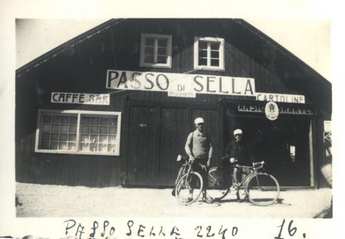 Il rifugio era lo stesso edificio, un po’ ristrutturato ma chiaramente lo stesso, di quella sua foto del luglio 1935. Impossibile sbagliarsi: tetto spiovente, due finestre con i serramenti bianchi e l’espositore per le cartoline. Al posto del cartello “Cartoline dal Passo Sella” oggi c’è un modernissimo orologio digitale che indica ora, temperatura, pressione barica, tendenza meteo. Per il resto nessuna differenza.