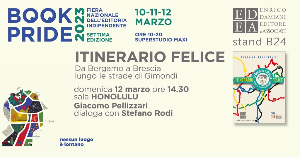 Felice Gimondi, Norma Gimondi, Sigismondo Exposito (poi, più semplicemente, detto Gimondi), Bergamo Brescia Capitale Italiana della Cultura 2023, il Vittoriale delgi Italiani e Gabriele D’Annunzio, la Mille Miglia e Giangiacomo Feltrinelli, Fausto Coppi, un fegato centenario, un falco e un pirata, Bob Dylan e Cormac McCarthy, Bruce Springsteen e Boris Pasternak, il Dottor Zivago e le sigarette Senior Service, le incisioni rupestri della Valcamonica e gli gnomi intagliati da un misterioso artista sulla salita del Vivione, l’Atalanta, la corsa si Carletto Mazzone verso la curva e un cesso con le strisce coi colori dell’iride, Eddy – Cannibale – Merckx, Vittorio Adorni e la cedrata Tassoni, i limoni del Garda e le Torbiere del Sebino, i vini del Franciacorta e gli hamburger del Bike Fellas, un trattore alto 3 metri, 2 bicchieri di Pirlo, mia nonna e il suo cappello a falde larghe, una Fiat 128 verde pisello con problemi evidenti allo spinterogeno, il papà e le sue fisime per le Autostrade, il formaggio Tombea e i fienili di Cima Rest, una strada costruita per farci passare un carico di legna, 7 fratelli che non si rivolgevano la parola, il vecchio confine tra Italia e l’Austria Ungheria, i ponti di Madison County e John Wayne in un western di John Ford, un’acqua non potabile ma buonissima, un giardino dai frutti proibiti, un pergolato frondoso e la Delorean di “Ritorno al Futuro”, Baudelaire, gli Indiani d’America e Raymond Poulidor, Petrarca e il Mont Ventoux, Alessandro Manzoni e un oste che la sa lunga, un cinghiale e un mucca pezzata rossa, Adriano De Zan e il lago d’Iseo, un tabaccaio dove tutti si ammalano di uno strano morbo, l’Oglio, il Brembo, il Serio e il Monte Pizzoccolo, i “mangia e bevi” e Google Maps, Martin Heidegger e il camionista Mosè, la Coca Cola e il ghiacciaio dell’Adamello, la pozione magica del druido Panoramix e i coregoni di Gargnano, i Ferragnez e la magica forra della Val Taleggio, Leonardo Da Vinci e il Selvino, il Casino di Gardone Riviera e l’Antologia di Spoon River, Paolo Savoldelli, la Presolana e il Garmin che fa le bizze, il Grand Canyon e Luigi Locascio, l’Overlook Hotel, Marco Pantani e Roland Barthes, gli ermellini della val Brunone, Henry Thode e Richard Wagner, il Klondike di Paperon de’ Paperoni e la vecchia ferrovia della val Sabbia, l’amore e la malinconia, il rumore del vento e quello delle ruote che girano. Il tutto anticipato come detto in una lunga chiacchierata con Stefano, e magari i vostri interventi, domenica 12 marzo alle 14:30 alla Sala Honolulu- Book Pride 2023 (sotto i dettagli). Be there, me racumandi. E – come diceva Felice – “poche chiacchiere e menare”.