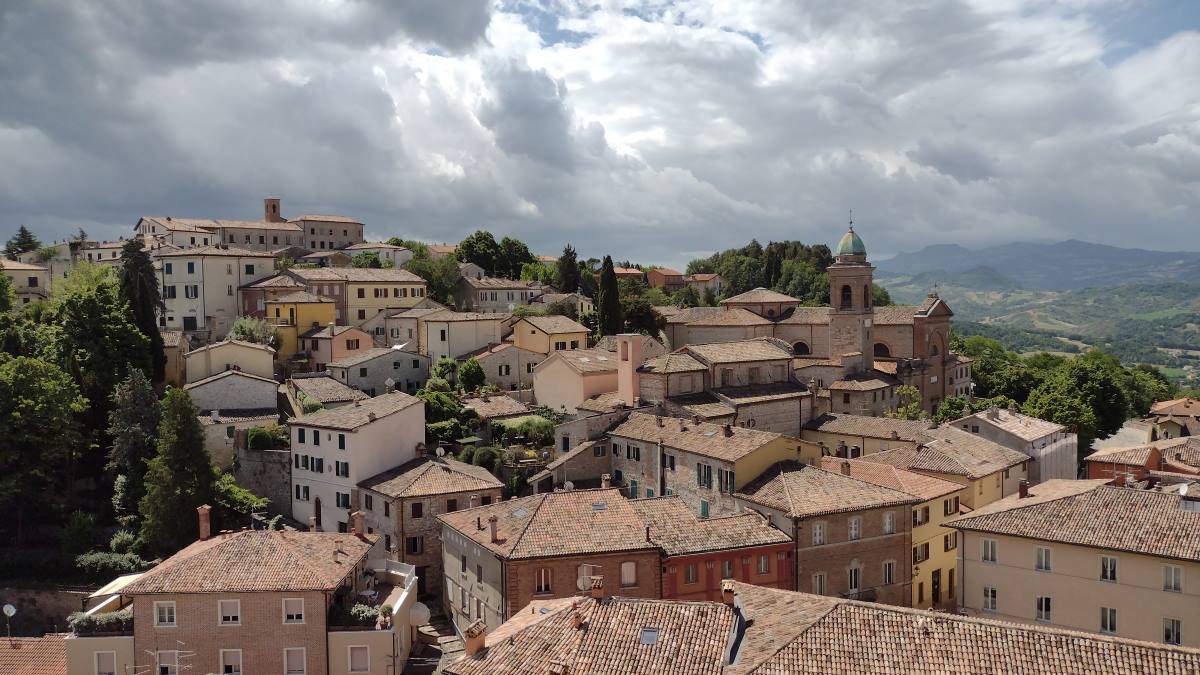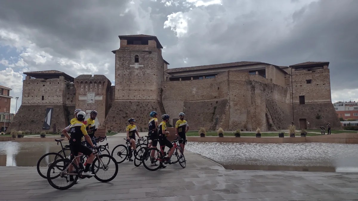 Ospitato da Visit Romagna / Apt Servizi e dal consorzio di bike hotel Terrabici, con un mese esatto di anticipo rispetto alla Grand Depart di sabato 29 giugno, ho pedalato anche io, in parte, sulle strade che assegneranno la prima maglia gialla. Ho avuto la fortuna di toccare con mano le asperità dei colli romagnoli finali verso Rimini. Quel su e giù che ogni partecipante della mitica Nove Colli conosce a mena dito, incluso il Barbotto (seppure affrontato dal versante opposto). Ho visto i borghi che ancora non conoscevo: Verucchio su tutti, bellissima, abbarbicata tra erba e roccia e spazzata quel giorno da vento e nuvole. Non sarà una passerella per i corridori questa prima frazione. Tutt’altro: pronti via, 3847 m di dislivello! Questo il biglietto da visita della Firenze – Rimini. Che gli Appennini non scherzano affatto e chi si prende la maglia sabato, potrebbe essere anche chi la terrà a Parigi tre settimane dopo. Chissà chissà. No, non voglio parlar qui di Tadej e Jonas (con l’aggiunta della mina vagante Primož). Di quello parleremo a tempo debito. Qui resta la mia impressione sul percorso del primo giorno. Tosto, contratto, da catena continuamente in tensione, senza molto per riposare. Una Nove Colli per pro, insomma, per restare in tema. Con alcuni amici e colleghi a fine maggio ne abbiamo percorso un tratto, quello forse più selettivo, partendo proprio dal luogo d’arrivo, Rimini e pelando a ritroso.